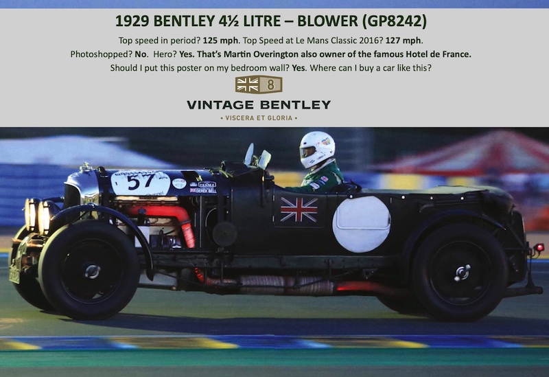 I was completely blown away by Martin Overington’s performance at Le Mans Classic 2016. It was late and I was sitting in the grandstand on the pit straight. I had never seen a vintage Bentley driven at that speed before. The glowing red of the exhaust as it exited the manifold set the tone!